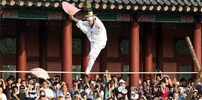 韩国首尔景福宫,为庆祝中秋节,韩国举行民俗文化节,一名表演者正在展示自己的绝活技艺。