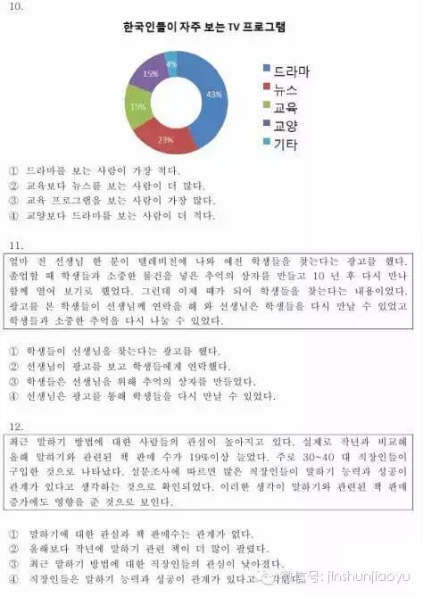 阅读的主题也较往届新颖有趣,重点内容包括心灵治疗和读书(마음치료, 독서)、综合性人才(‘주제’수업, 통합적안목을가진인재)、新造词(신조어)、饥饿营销(제한된기간, 정해진양)、定制产品(맞춤형상품)、眼镜大众化(안경대중화)、国际交流合作(국제적교류협력)、小说之地震(지진)、和爸爸的交流(아버지와의대화)、心情好坏与工作(기분, 집중력, 주의력)、扇子的作用(부채의역할)、牛奶与成人病(우유, 성인병)、地铁运行延迟(지하철운행지연)、美术作品在电影中的作用(미술작품, 영화)、韩屋缺乏管理(한옥의 관리 필요성)、同群体利益问题(동일종, 개체, 이익)、退休年龄延长(정년 60세의 무화시대)等。