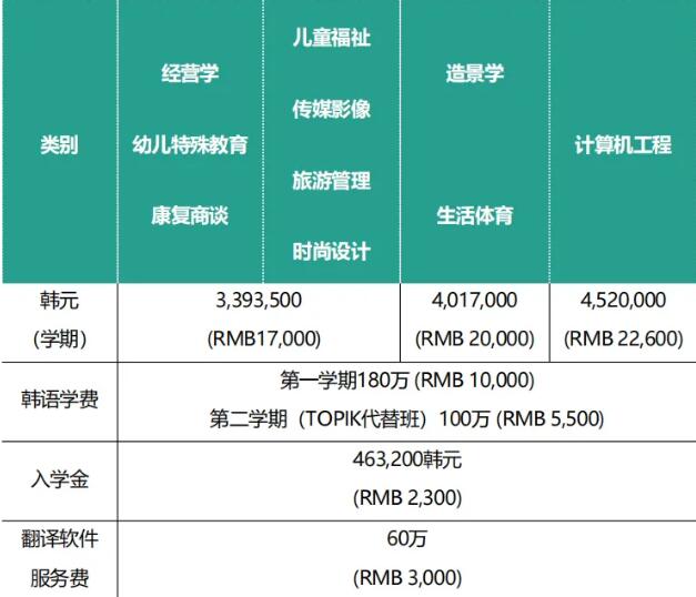 1.酒店经营、航空观光学、观光会展学、不动产学、社会福利学、儿童学、人文文化融合学、老人福利商谈学、Law&Biz学系:301.9w韩元/学期(约RMB 1.5w/学期)